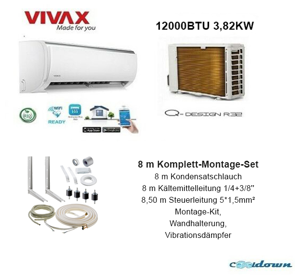 VIVAX Klimaanlage Q Design Klimagerät 3,52KW 12000BTU Komplett Montage Set 8 m