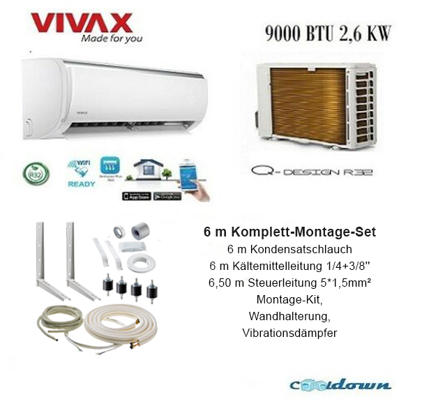 VIVAX Klimaanlage Q Design 2,6KW 9000BTU Klimagerät A++ Komplett Montage Set 6 m